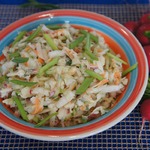 Я делаю коул-сло из капусты, моркови, нашинкованных соломкой свежих огурцов (как на окрошку) и либо яблок (свежий, легкий вариант), либо тертого сыра (более сытный вариант, для пикников хорошо). Ну и с зеленью, конечно, с зел.луком как раз очень нравится
