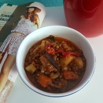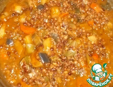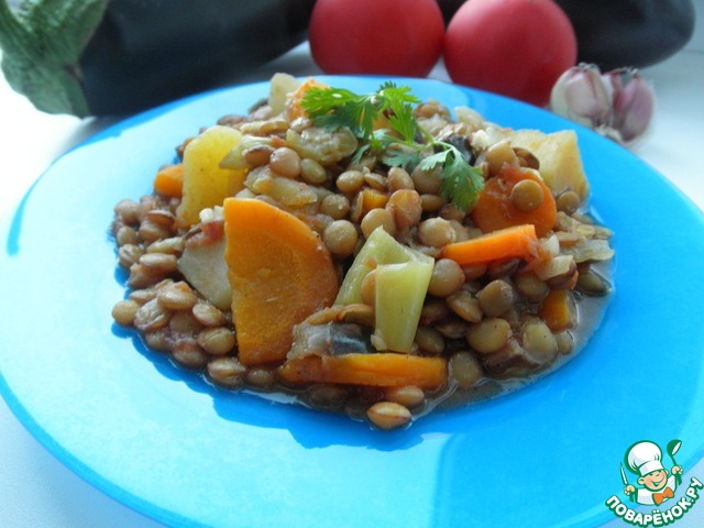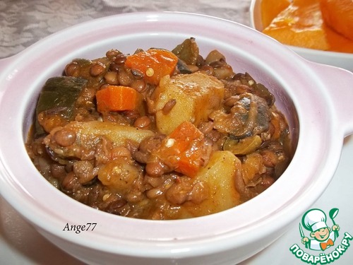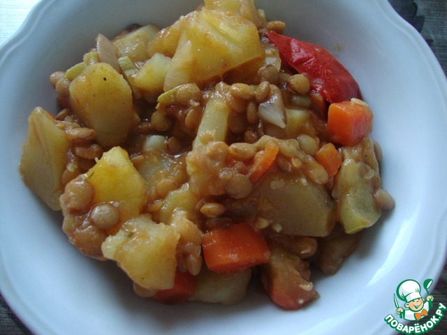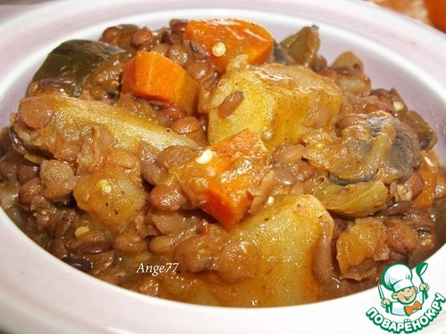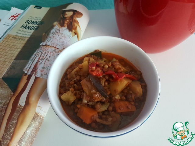 Тушить до полной готовности чечевицы и овощей. За пять минут до готовности положить на поверхность половинку перчика чили хвостиком вверх, затем его удалить.
