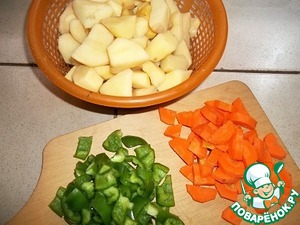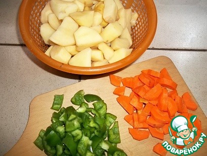 Подготовить овощи. Картофель нарезать большими кусочками, морковь и зеленый перец тоже не мельчить. Лук нарезать четвертинками колец. -