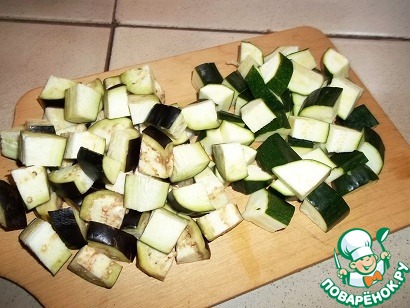 Цуккини и баклажан нарезать крупными кубиками. Помидоры натереть на мелкой терке с кусочком имбиря (с помидоров можно предварительно снять кожицу, я этого не делаю, так как при натирании она сама отделяется). Нарезать зеленую часть лука-порея. Я взяла замороженную заготовку.