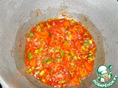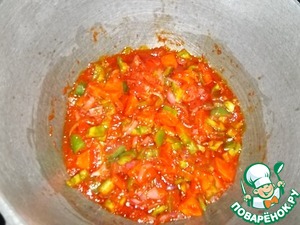 В кастрюле с толстыми стенками (или сотейнике) разогреть раст. масло, добавить лук и морковь. Жарить пару минут до прозрачности лука. Добавить томатное пюре, томатную пасту и зеленый перец. Жарить около 10 минут.