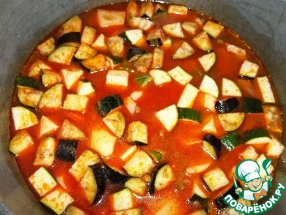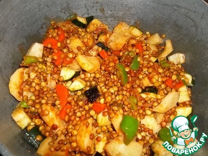Добавить промытую чечевицу, баклажаны, цуккини, картофель, перемешать.