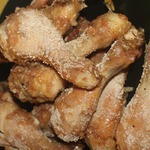 Для панировки смешать в равных количествах пшеничную и рисовую муку с кукурузным крахмалом, добавить щепотку разрыхлителя. Можно воспользоваться готовой панировкой для темпуры. Голени обмакнуть в панировку и разложить на лист, покрытый пергаментом для выпечки.