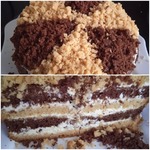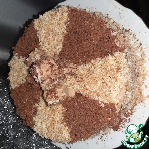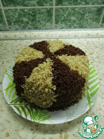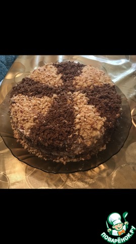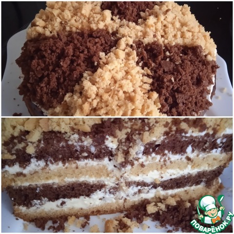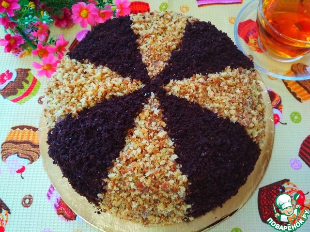 7. Собираем торт: выкладываем поочередно светлые и темные коржи, промазывая их кремом