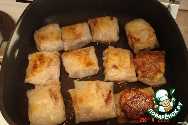 На раскалённой сковороде обжариваем конвертикис двух сторон до румяной корочки.