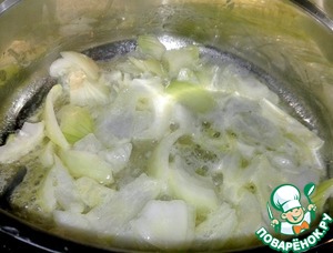 Кастрюлю с толстым дном разогрела и положила в неё масло. В течение трёх минут обжарила на масле нарезанный лук.