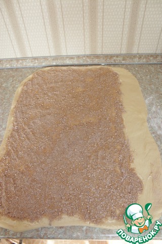 Когда тесто увеличится вдвое (через 1-2 часа), достаем его и обминаем. Раскатываем в прямоугольник размером 45*25 см на присыпанной мукой поверхности. Смазываем размягченным сливочным маслом, вдоль длинной полосы оставляем край 2,5 см не покрытый маслом. Посыпаем сверху начинку, слегка ее вдавливая.