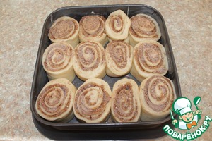 Скручиваем тесто в рулет, двигаясь при этом в сторону непокрытого маслом края. Ножом разрезаем на равные порции (примерно 3,5 см). Наши "улитки" укладываем в смазанную сливочным масло форму. Оставляем в теплом месте на 30 минут.