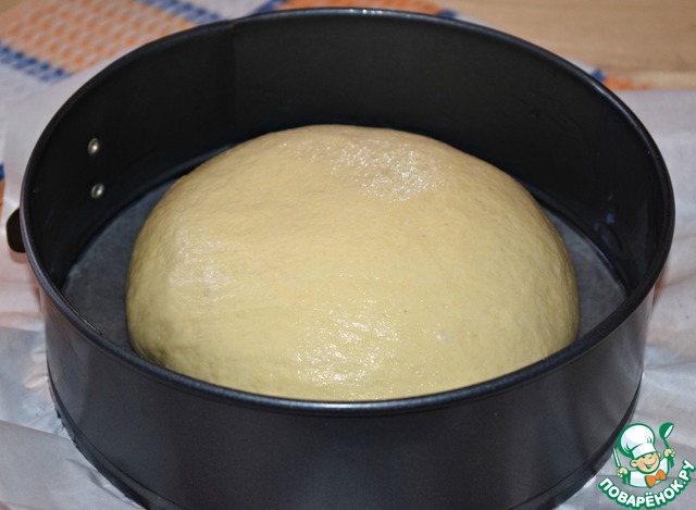 Выложить тесто в чашку, смазанную растительным маслом, затянуть пищевой пленкой и поставить в теплое место для подхода на 55-60 минут.