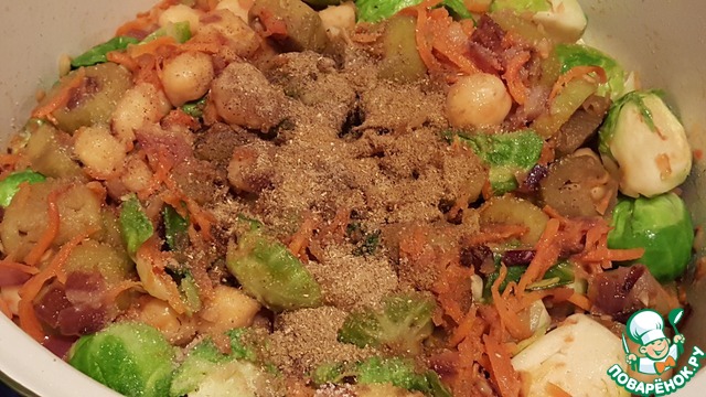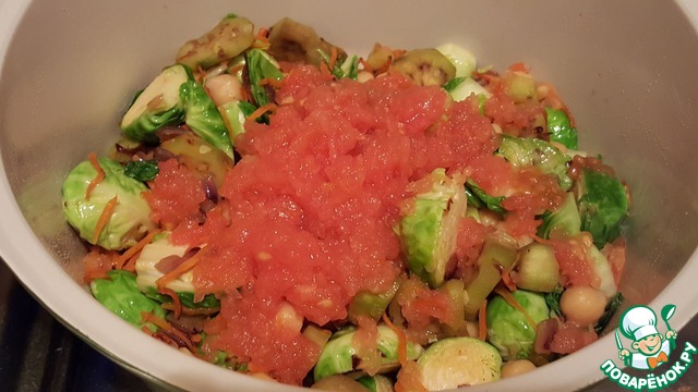 Добавить баклажаны, брюссельскую капусту и нут. Помешивая обжаривать на среднем огне, следить, чтобы не пригорало, при необходимости можно влить немного кипятка.