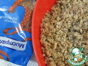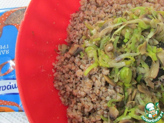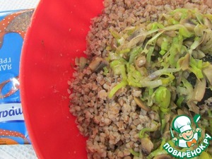 Соединить гречневую крупу и грибы. Хорошо перемешать