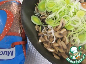 На сковороде разогреть оливковое масло. Обжарить шампиньоны и добавить лук-порей. Обжаривать несколько минут до мягкости лука. Затем посолить и поперчить. Снять с огня.