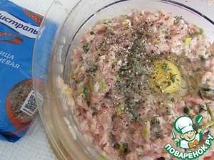 Вбить в массу яйцо. Посолить, поперчить, добавить листочки тимьяна и хорошо вымесить фарш.