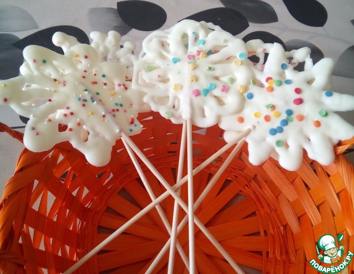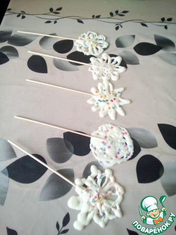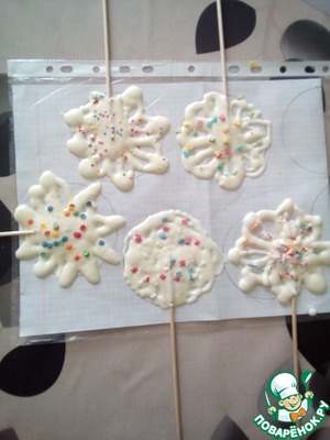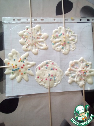Рисунок может быть любым: ромашка, звезда, розочка и все что угодно вам. Наносить шоколад нужно потолще, т. к. шоколадные кружева очень хрупкие. При желании посыпаем кондитерской посыпкой.