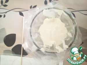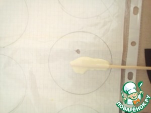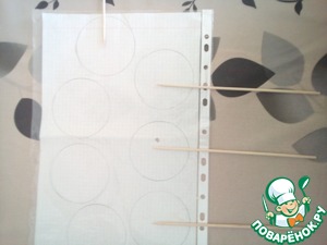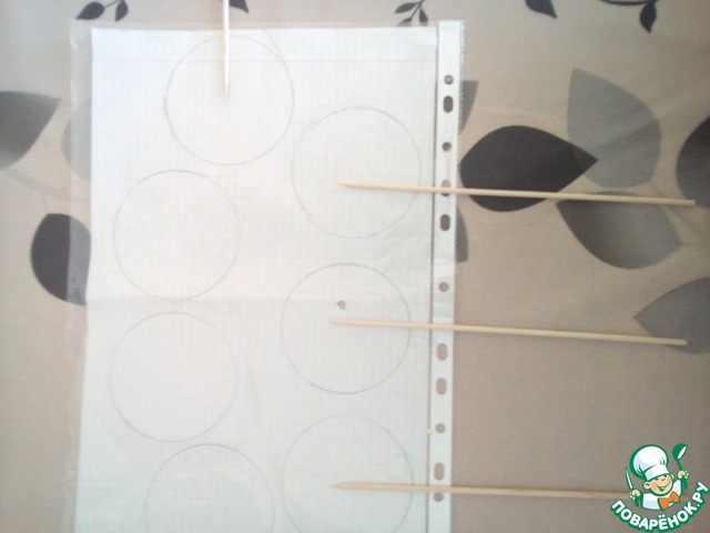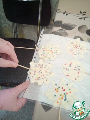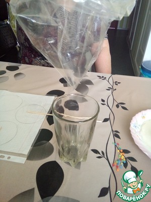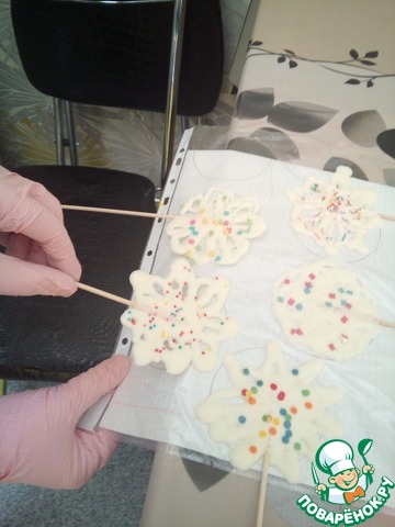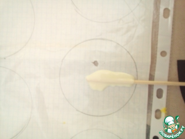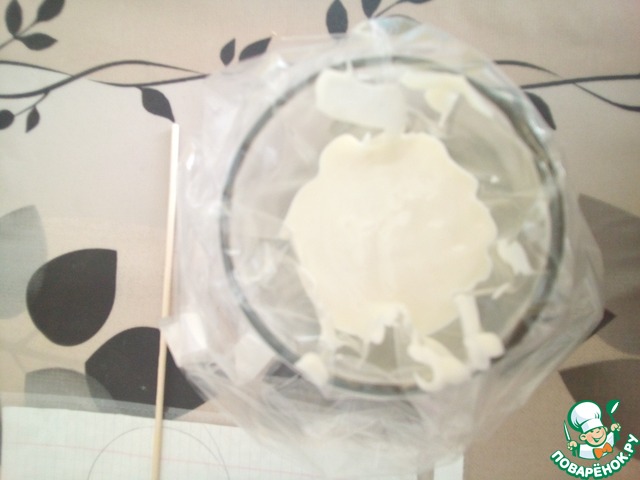 А теперь пользуясь мультифорой (файлом) как кулинарным мешком начинаем рисовать кружева шоколадом. Предварительно наливаем небольшую часть шоколада на палочку.