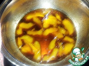 В кастрюлю налить 100 мл воды, добавить 100 гр сахара (1:1), кусочки апельсиновой цедры и проварить в течение 5-7 минут. Затем цедру убрать, сироп охладить.