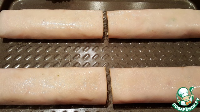 Смазать маслом противень или форму для запекания и выложить роллы стыком вниз. Сверху я смазала роллы также маслом. Я использовала кокосовое масло. Включить разогрев духовки 200°.