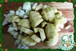 Берем кастрюльку с толстым дном. Ставим на огонь, кладем сливочное масло и обжариваем только до прозрачности лук, потом выкладываем картошку, перемешиваем, добавляем мускатный орех и соль, вливаем горячую воду.