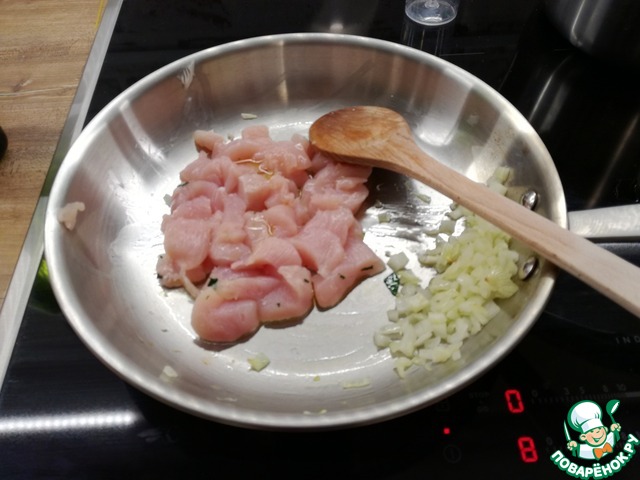 Выкладываем на сковороду кубиками нарезанное куриное филе. Обжариваем до золотистого цвета.