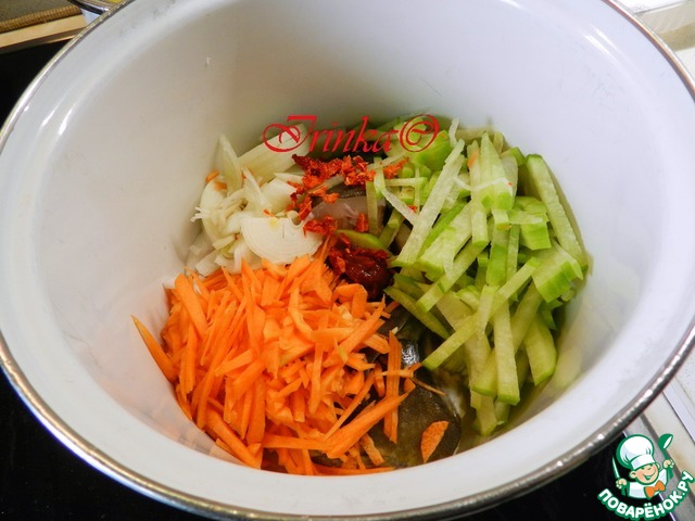 Шинкуем редьку и морковку на корейской терке или просто нарезаем мелкой соломкой; репчатый лук нарезаем полукольцами, стручковый перец-кусочками длиной 1-2 см. Все укладываем в кастрюлю поверх рыбы. Добавляем кочудян.