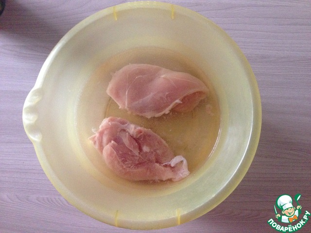 Куриную грудку промыть. Залить соленой водой на 2,5-3 часа и оставить мариноваться при комнатной температуре. Соль берём из расчета 2 ст. л с горкой на 1 литр воды.