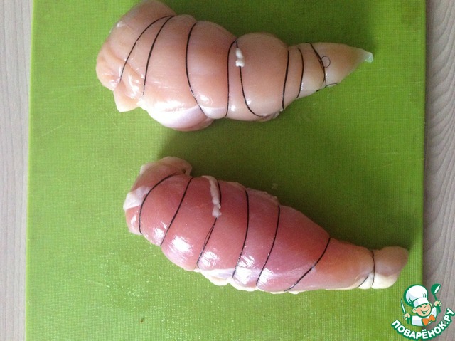 После грудку вынуть, просушить бумажным полотенцем и обмотать кулинарной нитью. У меня таковой не было, поэтому обмотала обычной плотной нитью.