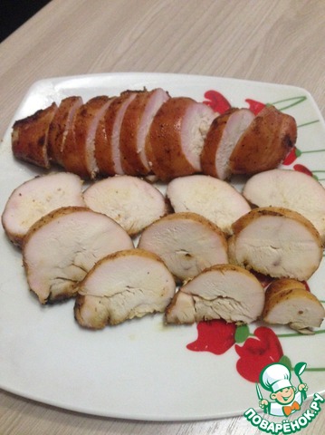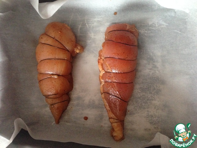 Куриную грудку выложить на противень, застеленный бумагой для выпечки и отправить в разогретую духовку на 20 минут. Спустя 20 минут духовку выключить и дать курице ещё постоять 30 минут.