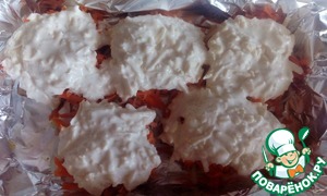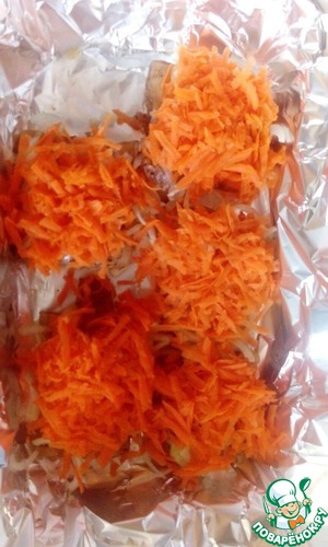 • Выкладываем в форму рыбу, лук и сверху морковь.