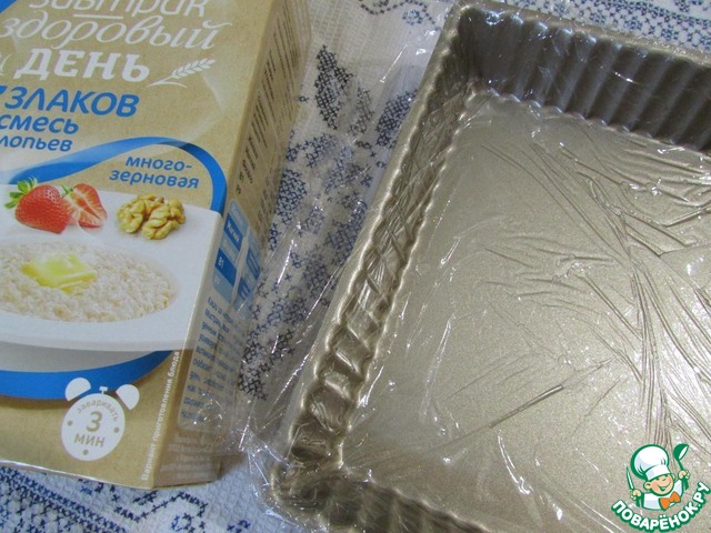 • Форму для выпечки (21х21х4) смочить холодной водой и застелить пищевой пленкой, чтобы свисали края.