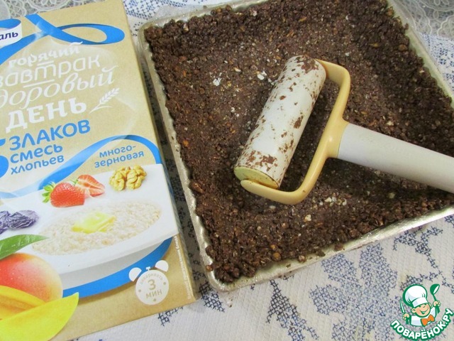 • Выложить шоколадную массу в форму, равномерно распределяя её. Хорошо утрамбовать, формируя бортики. Отправить форму в холодильник на 1 час.