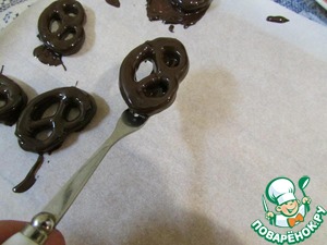 Застелить разделочную доску бумагой для выпечки. Шоколад распустить на водяной бане. Поочередно обмакнуть в него бретцели, дать стечь излишкам шоколада и выложить бретцели на пергамент (я делала это с помощью вилки). Доску с печеньями отправить в холодильник на 10 минут.