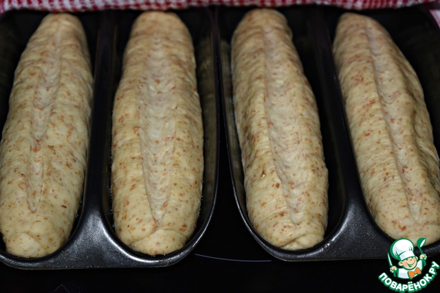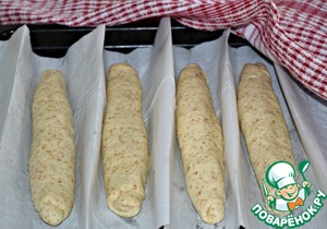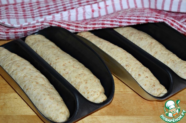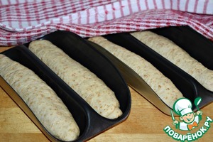 Сформированные багеты выложить в специальные формы. Вот такие формочки остались у меня от ХП. Прикрыть льняным полотенцем и оставить на 7-10, пусть "отдохнут". В это время включить духовку для разогрева, выставить температуру 180*.