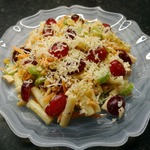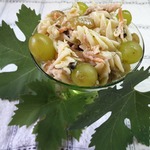 К тому-же,курица с ягодами или фруктами-это всегда вкусно. А салаты на макаронной основе,летом,у нас частые гости,потому что очень жарко и горячие блюда ещё больше усугубляют это состояние, а кушать что-то днём надо. У меня 2 лозы растут,снимаем по-5-6 ведёр винограда,так что будет куда часть его применить