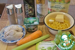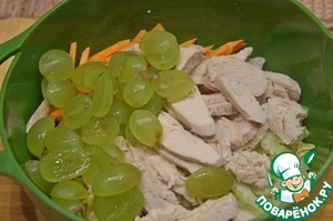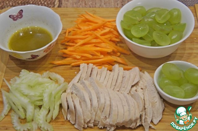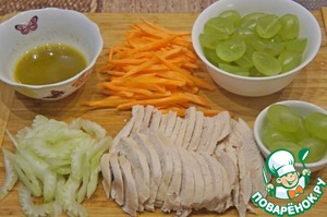 Курицу нарезать на тонкие ломтики, Морковь - тонкими брусочками, сельдерей - тонкими кусочками. Несколько ягод винограда оставить для украшения, остальные разрезать на половинки и удалить косточки, если они есть. -