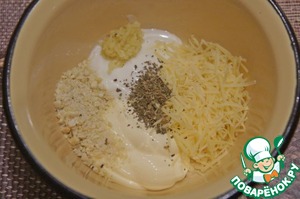 Сыр натереть на мелкой терке, чеснок измельчить. Орехи растолочь (у меня не оказалось под рукой кедровых, использовала миндаль).