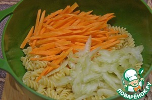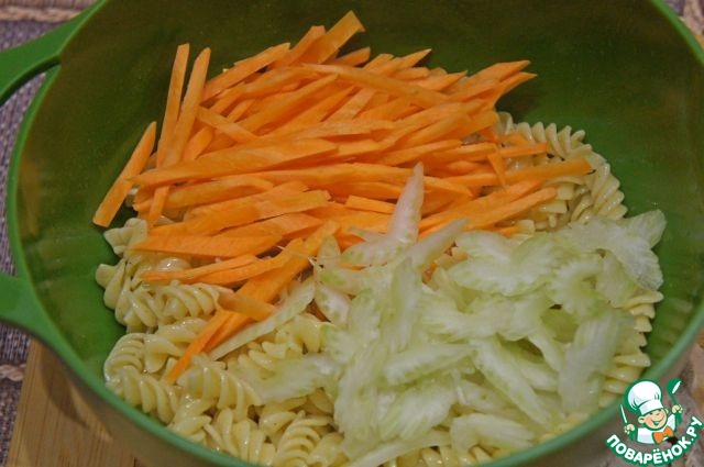 К макаронам добавить курицу, сельдерей, морковь и виноград.