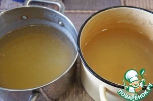 Сварить говяжий и куриный бульон из косточек, процедить. 1/4 стакана говяжьего оставить для приготовления фрикаделек.