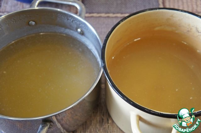 - Бульон (1,5 говяжьего и 1,5 л куриного) — 3 л