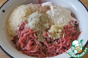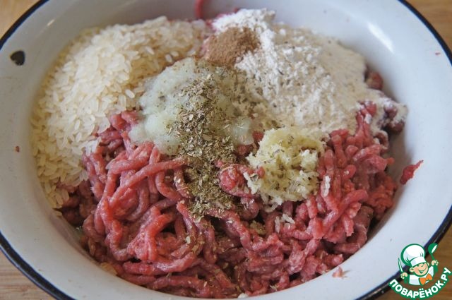 Выложить в миску фарш, добавить бульон, муку, рис, натертую на терке луковицу и пропущенный через пресс чеснок. Приправить солью, орегано и небольшим количеством молотого тмина.