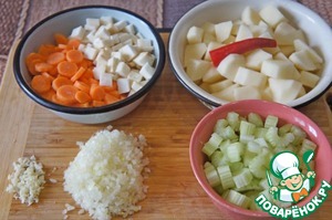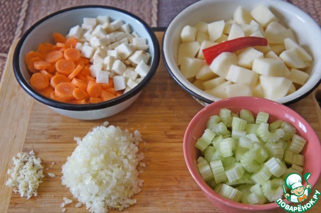 Хорошо промыть сельдерей и нашинковать стебли дольками по 0,5-1 см. Морковь помыть, очистить и нарезать дольками по 0,5–1 см. Очищенный картофель нарезать кубиками величиной 2 см. В таком виде его должно получиться примерно 5 стаканов. Удалить верх и низ у перцев чили. Луковицу измельчить, чеснок нарезать ножом. Нашинковать кинзу. Должно получиться 0,5 стакана. Нарезать шпинат. Необходимо 2,5-3 стакана.