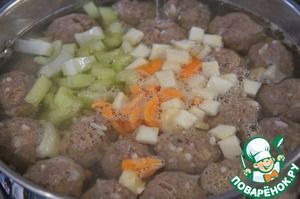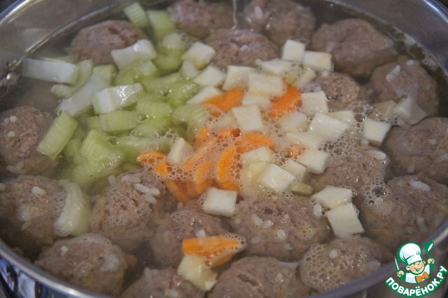 В большую кастрюлю влить оба бульона. Кастрюлю поставить на медленный огонь. Как только бульон закипит, выложить фрикадельки и варить на среднем огне 15 минут.