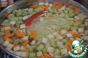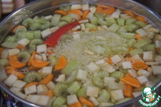 Через 15 минут положить в суп нарезанные овощи и перец целиком, кроме шпината и кинзы.