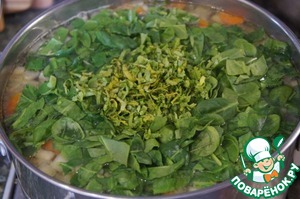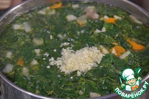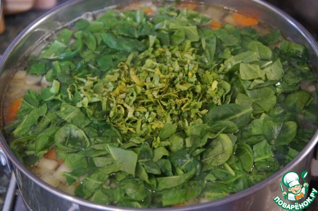 За 5 минут до завершения приготовления добавить шпинат и кинзу.