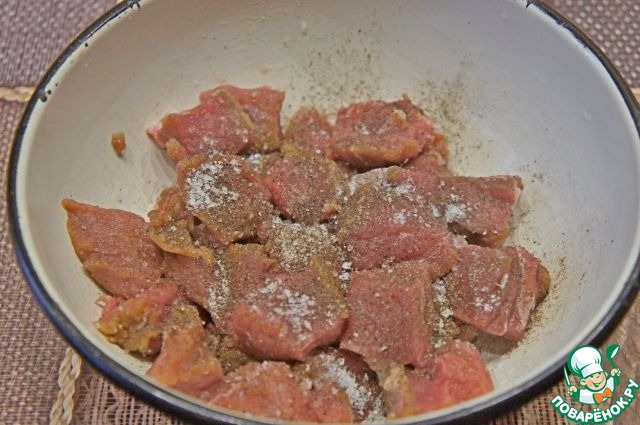 • Мясо нарезать, посолить и поперчить.