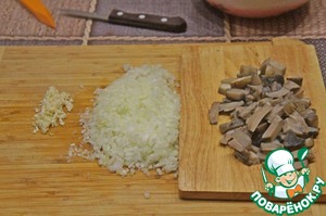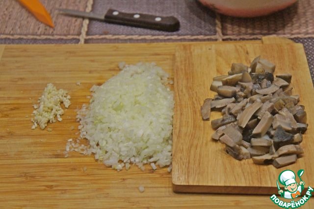 • Грибы отварить, нарезать. Лук и чеснок измельчить.