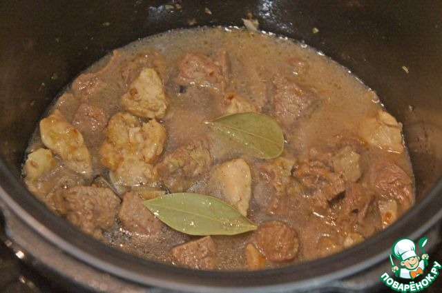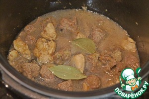 • Смешать мясо и зажарку, влить бульон, положить лаврушку и тушить до готовности.