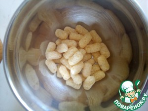 Я брала совсем мальнькую порцию на 3 конфеты, чтобы показать вам технологию приготовления. Готовила с обычной сгущенкой и без масла. Вы можете брать ингридиенты на ваш выбор. Например, готовить как я, или взять вареную сгущенку и добавлять масло, или обычную сгущенку и тоже с маслом, или вареную сгущенку без добавления масла. Это дело вашего вкуса, экспериментируйте. Берем кукурузные палочки.