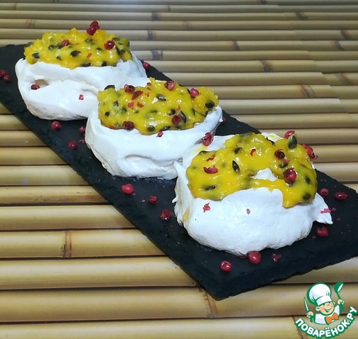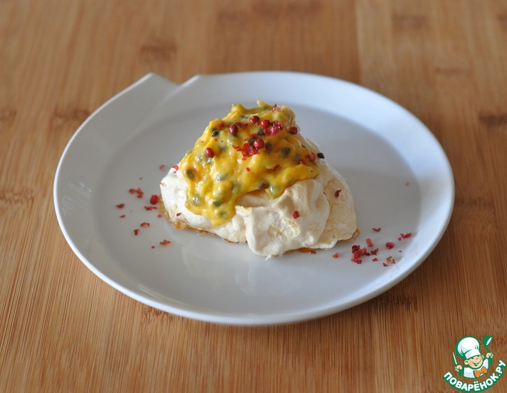 Меренги - десерт, придуманный во Франции, состоит он из взбитых с сахаром и запеченных яичных белков. По мне так он слишком сладкий, поэтому пришлось добавить кисловатый крем из маракуйи и пряный розовый перец. Попробуйте и Вам точно понравится. Приятного аппетита!