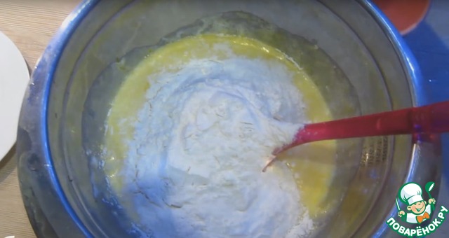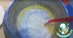 Добавляем соду (гашенную лимонным соком или уксусом), муку.