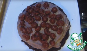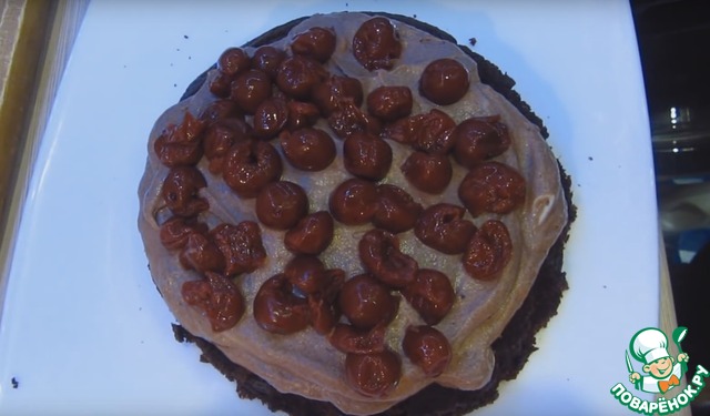 Первую часть смазываем половиной крема и укладываем на крем вишню.